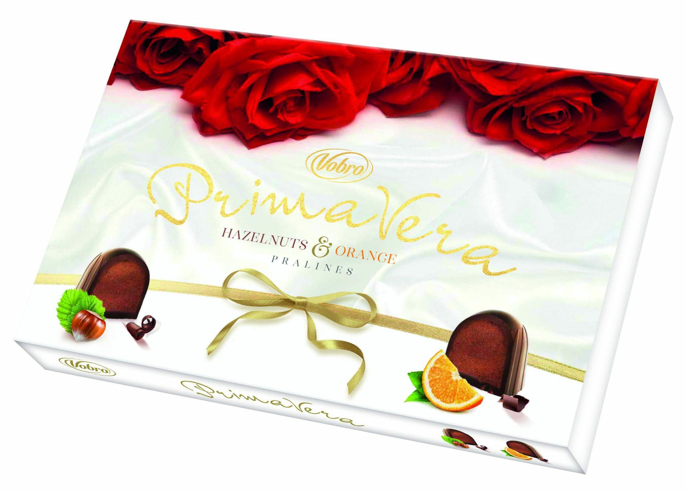 Bombonierka Vobro Primavera 140g. Smak pralin idealnie łączy polewę z deserowej czekolady wraz z dwoma smakami nadzienia – pomarańczowym i orzechowym. Słodkie wnętrze daje ogromną radość z jedzenia oraz jest nieodpartą pokusą do sięgnięcia po kolejne cukierki. Eleganckie opakowanie sprawia, że idealnie nadaje się jako prezent bądź słodki upominek. Wytwarzane są według niezmiennej kilkudziesięcioletniej receptury. Przez to ciągle utrzymują ten sam oryginalny smak oraz zagarniają sobie całą rzeszę fanów.